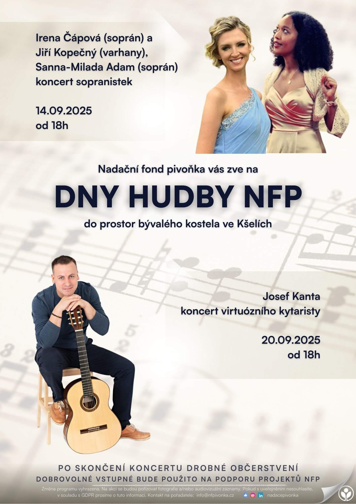 Zažijte kouzlo klasické hudby v podání dvou sopranistek, Ireny Čápové a Sanny-Milady Adam. Přijďte si poslechnout jejich nádherné hlasy v prostředí bývalého kostela ve Kšelích. Koncert se uskuteční 14. září 2025 od 18:00 hodin.